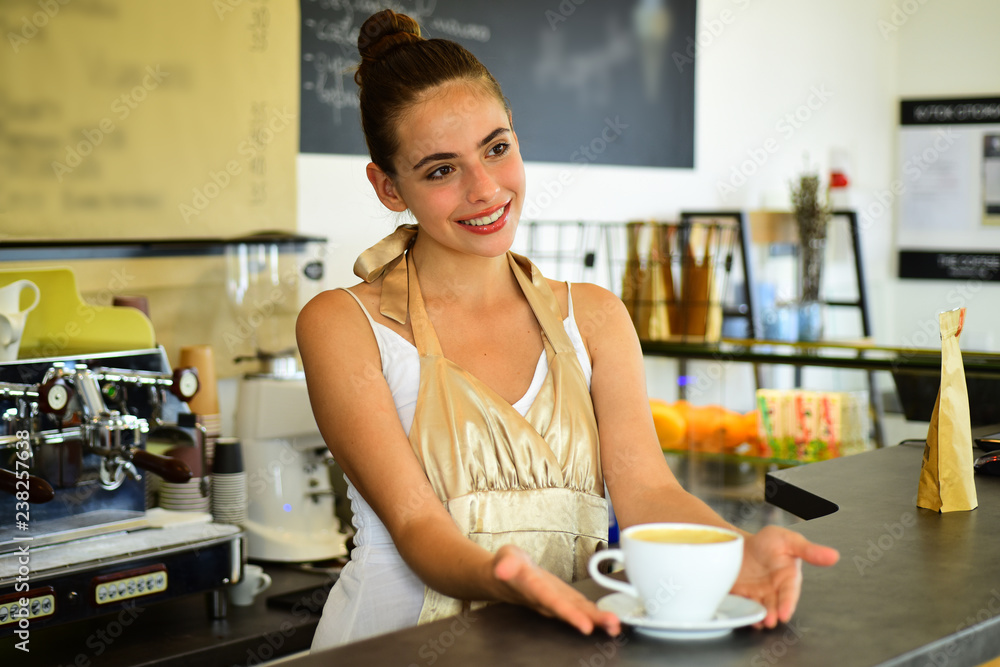 Todays Good Mood Is Sponsored By Coffee Woman Barista In Coffee Shop Barista Serve Cup Of Hot Coffee Drink With Smile Pretty Woman Stand Behind Cafe Counter Brewing Coffee In Coffeehouse Stock